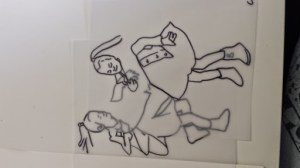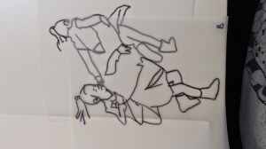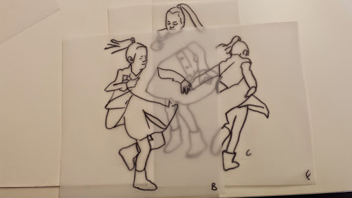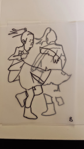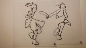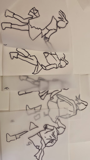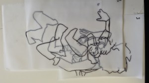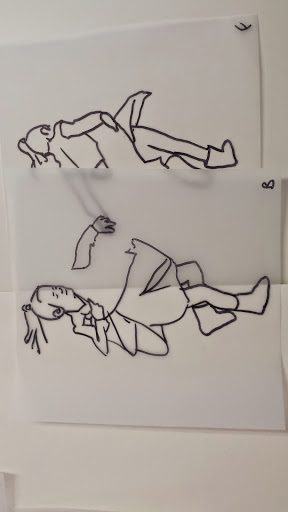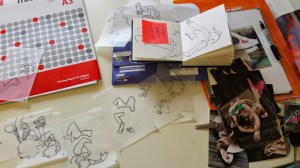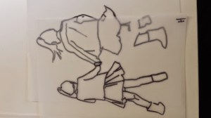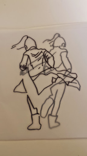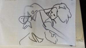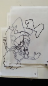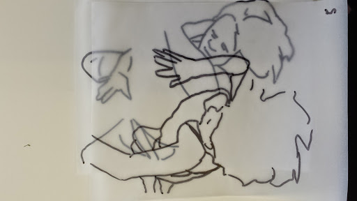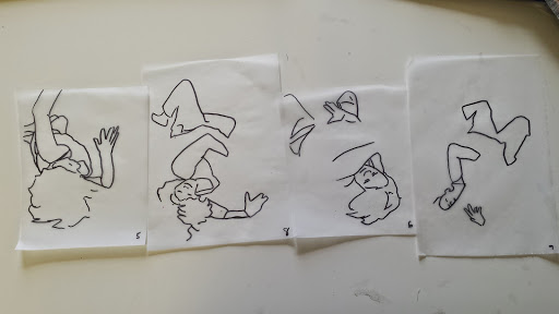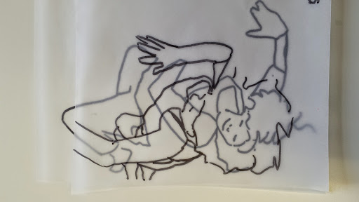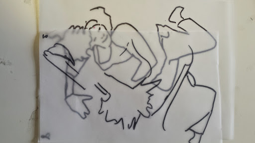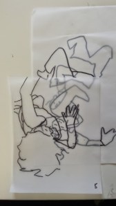 I got to the stage when I started to develop my ideas further in this final stage of the project, when I realised that I didn’t have the right visual material to my work forwards. I took guess another series of photos using fabric to secure the figure. This was directly inspired by my trip to Florence where I was really interested in the way that the sculptures had drapery which obscured parts of the body and sort of seem to strangle and wrap around figures partway through movement. In a series of photographs, I had three models myself and two others are very young girl and another adult female. We used quite heavy fabric to twirl around our bodies as we moved and I imagine that this would look like there was some sort of conflict still, which links with my earlier photos of struggle, but possibly conflict with the self. I printed about 250 photographs, this was after careful editing and selection. I felt it was really important to have a lot of images so that I could combine and further edit and crop, taking limbs from one figure to another, and making figures interact with themselves at a different stage of movement. Are used tracing similar to Jenny Savile to record the figures outlines. This helped me to bend combine different combinations of figures moving, to begin to consider new compositions for paintings. I wanted to show movement, and a sense of tangling, wrapping, and general struggle. Possibly some sort of fight, or a child being led away by another child. I hope that this would bring a sense of menace, or suggestion of something that might happen in the future, linking with my research into narrative painting. Below are some of the drawings layered and combined to devise different compositions. I then selected, and refined from these combinations of figures to take forward into the larger paintings.